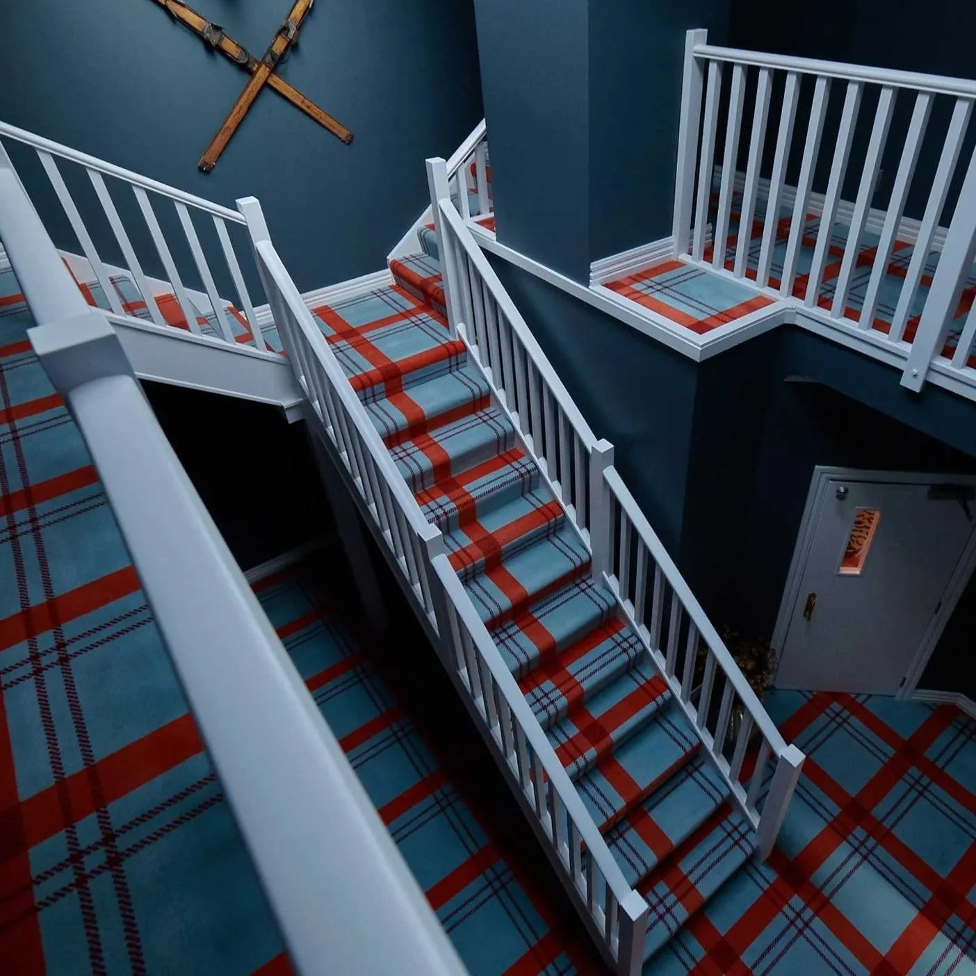 The design brief embraced contrast: rustic alpine influences combined with dramatic, colourful details. The carpet uses a striking tartan pattern in deep blues and reds, evoking a European ski chalet aesthetic, while feeling unexpectedly vibrant and contemporary. The carpet also helps ground the visual energy of bold wallpapers, eclectic furniture, and decorative flourishes, bringing cohesion and texture underfoot.-